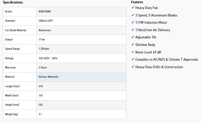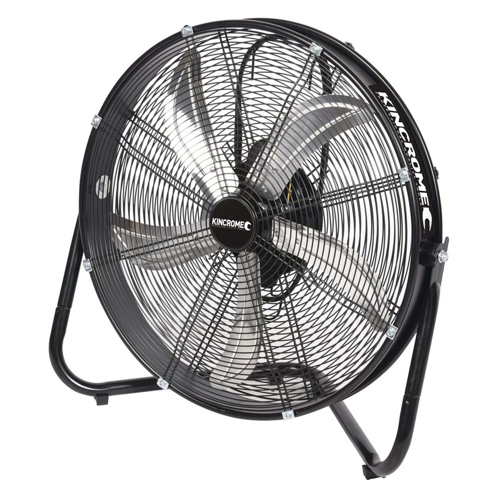 The 500mm (20”) Heavy Duty Floor Fan is packed with features to assist and help you get the job done comfortably. Features such as an energy efficient induction motor, 3 speed switch, high velocity air flow, heavy duty constructed frame, drum & safety grills, 5 aluminium blade construction & tilt function. The 5 aluminium blade construction is different to what is conventionally seen in the market delivering up to 5% more air velocity to most standard 3 blade fans available. With a cool air velocity of 110m³ per minute this unit is perfectly suited to ventilating small to medium areas inside. The tiltable drum body enables you to position the fan where needed and tilt the fan body allowing you to ventilate almost any area you need. The fan comes fully assembled and ready to go straight from the box which means no down time having to assemble it once you get home. The entire KINCROME fan range complies to all safety and standards requirements including testing conducted to tropical class T clause. Kincrome Heavy Duty fans are built tough and will last the distance when using them out in the field.