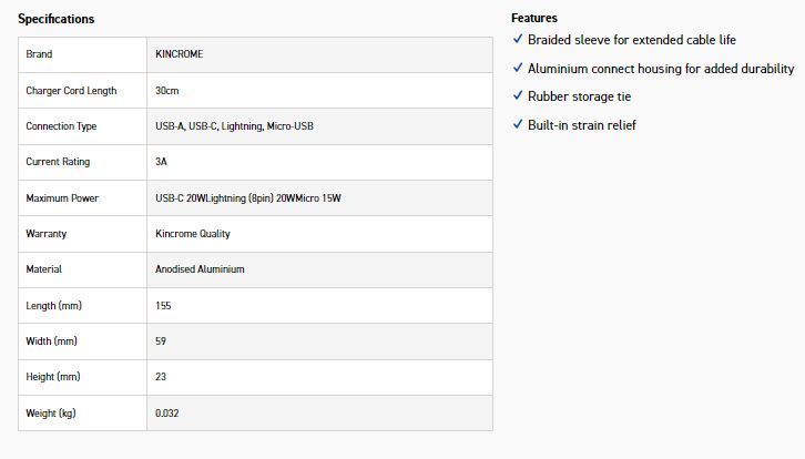The Kincrome range of USB charging cables is designed for the everyday user to the trade professional. They feature braided sleeves and aluminium connect housings for durability and extended life in the toughest conditions. Covering most popular connection types and MFi certified (where applicable). They’re ready to ensure some of your most important tools on the job are always charged and ready to go.