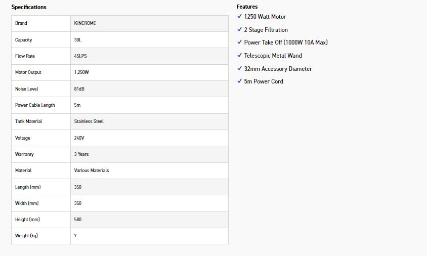 KINCROME KP703 VACUUM W&D 30LT S/S TANK PTO