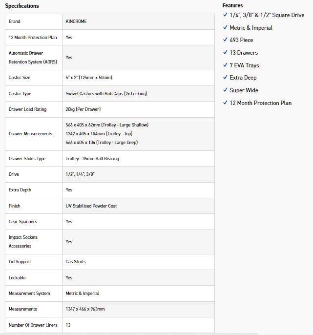 The EVOLUTION Range of Storage and Toolkits has been developed for the trade professional wanting value for money without compromising quality. EVOLUTION is loaded with premium features and trade tough tools for the professional user, but at a price not out of reach of the home user. Designed in Australia by Kincrome, the EVOLUTION range offers a storage or complete tool kit solution, for the serious home user, apprentice and trade professional.