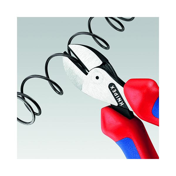 X-Cut® compact diagonal cutter with high gear ratio, chrome-plated, with multi-component handles. Cuts the thinnest strings as well as multi-core cables and piano strings. Powerful, lightweight and versatile. High cutting power with minimal effort thanks to optimal coordination of cutting edge angle and gear ratio. Box joint design provides highest stability with low weight. Double-supported joint axis for heavy loads. Large opening width for thicker cables. Cuts precisely, even through thin copper strings. Compact, lightweight design. Universally applicable in assembly, maintenance and production. 40% less force required compared to standard diagonal cutters of the same length. Chrome-vanadium heavy steel, forged, repeatedly oil-hardened. Compact tool for heavy tasks. Precise cuts in thin strings, thick cables and spring steel. Thanks to the geometry of the cutting edges and the high-quality chrome-vanadium tool steel, precise cuts in thin copper wires as well as thick, multi-core cables with a diameter of up to 12 mm are possible with the Knipex 73 05 160 X-Cut. The X-Cut cutting edges cut through nails and a wide variety of wires without any problems, right up to spring steel (piano strings). The small tool that saves energy. Due to the very high manual force transmission, around 40% less effort is required compared to conventional diagonal cutters of the same length. Weight of only 175 g, length of only 160 mm and large opening width: ideal statistics for this compact tool. High energy savings thanks to the high manual force transmission ratio. The box joint design of these compact diagonal cutters ensures maximum stability, as the handles of the pliers stabilize each other in the fold: The joint axis of the Knipex 73 05 160 X-Cut is mounted on both sides; the edges of the inner handle of the pliers are guided on both sides. The high-quality chrome plating makes it easy to clean and is also an advantage if the tool is kept permanently in a service vehicle, for e
