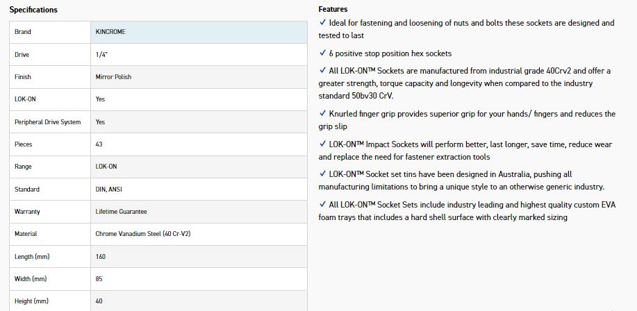 Kincrome LOK-ON™ Sockets, Sets and Accessories have been engineered beyond world-class benchmarks, exceeding all international torque and lifetime standards. Offering unique patented features such as the LOK-ON™ Socket’s ability to loosen up to 85% rounded/damaged fasteners, the LOK-ON™ range has been developed with both function and style in mind. Each component within the LOK-ON™ range includes features above and beyond the market’s expectation, setting a new benchmark for the professional quality tool industry.