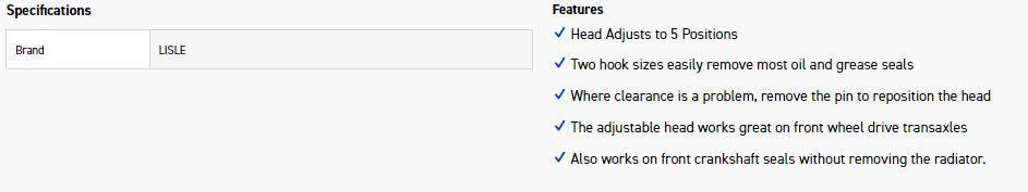 Two hook sizes easily remove most oil and grease seals