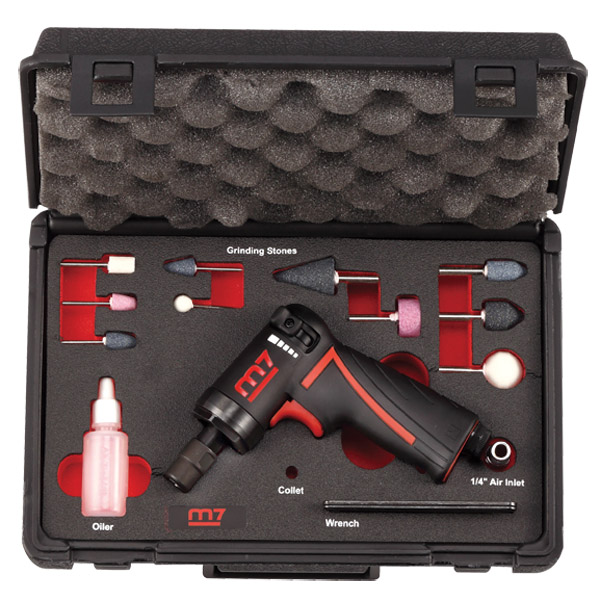 12 Piece Set Includes:. 1pc die grinder (M7-QA651B). 1pc 1/8″ collet. 1pc 1/4″ collet. 5pcs grinder stones 3mm. 5pcs grinder stones 6mm. 1pc 1/4″ plug. 1pc oil box. 2pcs spanner wrench