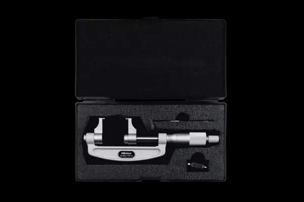 The Mitutoyo 143-102 mechanical caliper type micrometer delivers precise measurements on recessed features which regular micrometers are unable to achieve. The Mitutoyo caliper type micrometer features jaws constructed of hardened steel with carbide measuring surfaces and a hardened steel spindle to take precise measurements on recessed features. The micrometer’s ratchet stop mechanism provides a constant measuring force on the spindle to ensure accurate, repeatable measurements. The combination of the ratchet thimble and speeder enables a rapid spindle feed when measuring extensive dimensions for easy one-handed measurements.