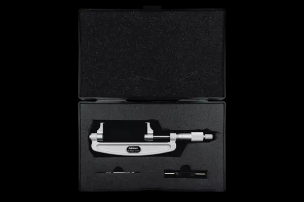 The Mitutoyo 143-104 mechanical caliper type micrometer delivers precise measurements on recessed features which regular micrometers are unable to achieve. The Mitutoyo caliper type micrometer features jaws constructed of hardened steel with carbide measuring surfaces and a hardened steel spindle to take precise measurements on recessed features. The micrometer’s ratchet stop mechanism provides a constant measuring force on the spindle to ensure accurate, repeatable measurements. The combination of the ratchet thimble and speeder enables a rapid spindle feed when measuring extensive dimensions for easy one-handed measurements.