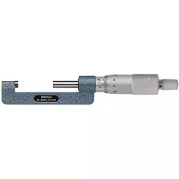 The Mitutoyo 147-302 hub micrometer is designed for precise measurements of hub thickness and shoulder inside a bore. The Mitutoyo hub micrometer features high-grade hardened steel on its frame, spindle and anvil to deliver precise, repeatable thickness and shoulder measurements. The micrometer’s ratchet-stop mechanism provides uniform pressure on a workpiece for precise, repeatable measurements. An inch Vernier scale provides outside diameter measurements.