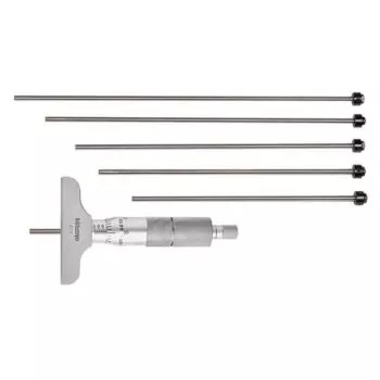 The Mitutoyo 129-128 depth micrometer with interchangeable rods measures a wide range of depths with high accuracy. A Vernier scale provides precise measurements in fine units. The Mitutoyo interchangeable rod type depth micrometer offers great versatility for measuring a range of depths with the included extension rods. The depth micrometer’s rod contact measuring points are lapped and carbide tipped for incredible flatness and better precision. The ratchet stop mechanism provides uniform pressure for precise, repeatable measurements.