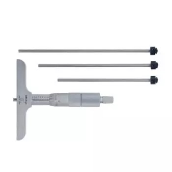 The Mitutoyo 129-131 depth micrometer with interchangeable rods measures a wide range of depths with high accuracy. A Vernier scale provides precise measurements in fine units. The Mitutoyo interchangeable rod type depth micrometer offers great versatility for measuring a range of depths with the included extension rods. The depth micrometer’s rod contact measuring points are lapped and carbide tipped for incredible flatness and better precision. The ratchet stop mechanism provides uniform pressure for precise, repeatable measurements.