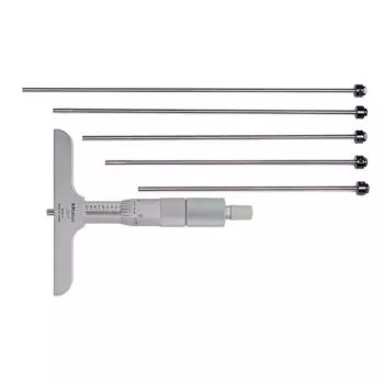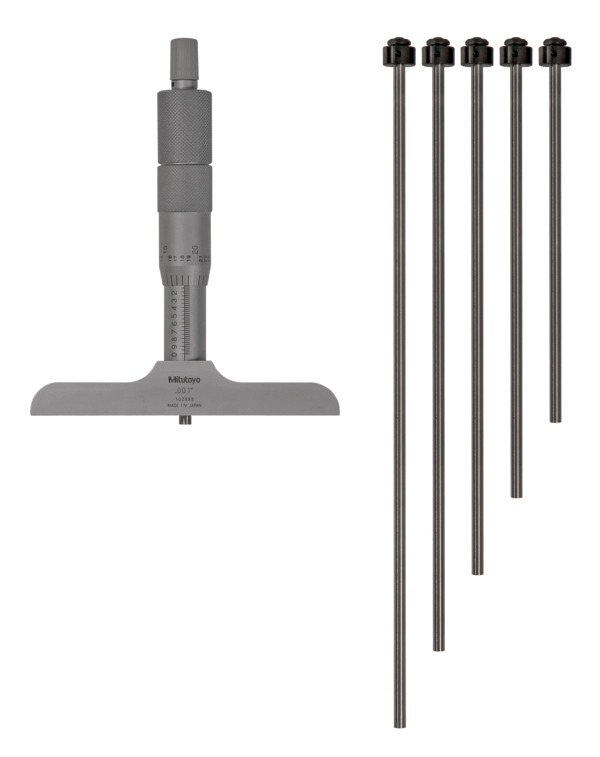 The Mitutoyo 129-132 depth micrometer with interchangeable rods measures a wide range of depths with high accuracy. A Vernier scale provides precise measurements in fine units. The Mitutoyo interchangeable rod type depth micrometer offers great versatility for measuring a range of depths with the included extension rods. The depth micrometer’s rod contact measuring points are lapped and carbide tipped for incredible flatness and better precision. The ratchet stop mechanism provides uniform pressure for precise, repeatable measurements.