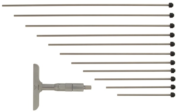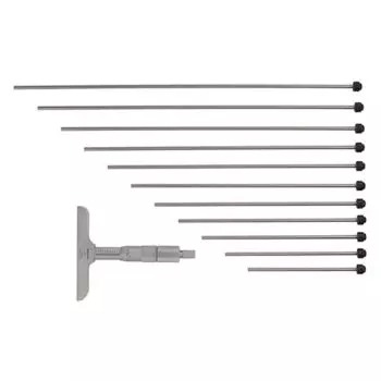 The Mitutoyo 129-150 depth micrometer with interchangeable rods measures a wide range of depths with high accuracy. A Vernier scale provides precise measurements in fine units. The Mitutoyo interchangeable rod type depth micrometer offers great versatility for measuring a range of depths with the included extension rods. The depth micrometer’s rod contact measuring points are lapped and carbide tipped for incredible flatness and better precision. The ratchet stop mechanism provides uniform pressure for precise, repeatable measurements.