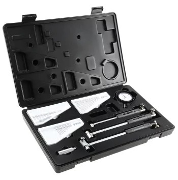 The Mitutoyo 511-921-20 standard type bore gage set features interchangeable anvils and spacers to take highly accurate diameter measurements of a wide range of bore hole sizes. Models are available with a Mitutoyo Dial Indicator. The Mitutoyo standard type bore gage is available in several different inch ranges to measure inside bore diameters with accuracy to +/- 2µm. The bore gage comes with interchangeable anvils to measure different bore diameters with the same gage. A pendulum guide structure permits the slide of the gage for measurements while a two-point contact system detects geometry anomalies such as roundness and taper. Mitutoyo offers a complete selection of Bore Gages. The 511 series bore gages come standard with interchangeable anvils and necessary accessories to perform close tolerance ID measurements.
