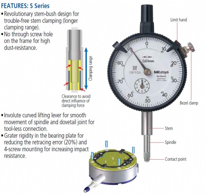 The Mitutoyo large dial face dial indicator combines excellent accuracy and reliability with a large, easy-to-read dial face. The 3417A stem design provides a long clamping range for use in many different applications. The spindle and stem are constructed of hardened, high-strength steel, and the jeweled bearing provides wear resistance and low friction movements for smooth, precise operations. The absence of a through screw hole helps protect the indicator against water and oil permeation. The crystal has a scratch and glare-resistant coating for clearer readings and better durability. The outer clamp and optional lifting lever can be attached to either side and can be easily installed or removed without the use of tools. The Mitutoyo Series 3 large diameter dial indicator measures surface variations with great accuracy displayed on an easy-to-read dial face.