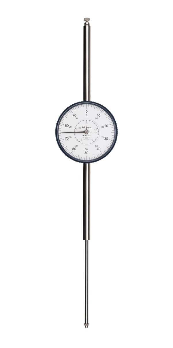 The Mitutoyo dial indicator has a black or white face, a choice of flat or lug, a 0.375″ stem diameter, and inch measurements. The indicator has a 0.375″ diameter stem, a #4-48 UNF contact point thread mount, and is used to measure surface variations in fractional inches. The choice of black or white dial and a contrasting hand help make measurements easy to read. The dial indicator comes with a choice of flat or lug back for a variety of mounting options. Flat back dial indicators are either clamp-mounted on the stem or plate-mounted on the rear of the indicator. Lug back dial indicators have a protrusion with a hole to mount the indicator using a lug or nut and bolt. Lug back dial test indicators usually come with the lug installed horizontally. The back on most indicators can be rotated to the vertical position. It has a stem design that provides a long clamping range, no through screw-holes on the frame for dust- and water resistance, and an involute curved lifting lever that provides smooth movement of spindle and dovetail joint for a tool-less connection. This dial indicator meets ANSI standards, Japanese Industrial Standard (JIS) B7503-1997, and American Gage Design (AGD) standards for face and thread size, and bezel and stem diameter.