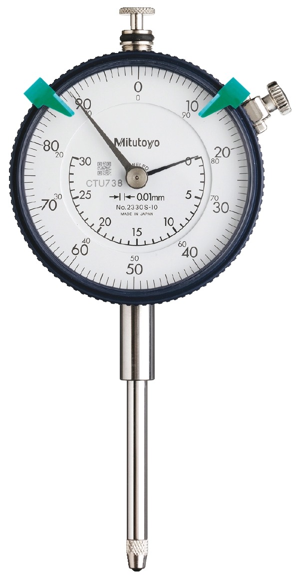 A Mitutoyo shockproof, multi-revolution dial indicator suited to general measurement applications. The jewelled movement provides lowest friction and stiction for smooth and precise operation and the dual-reading scale aids measurement in both directions.Long stroke dial indicators with a ΓΈ57 mm outer frame. All models are equipped with limit markers and a bezel clamp as standard. An O-ring is employed to ensure air-tightness between the outer frame and the crystal case to prevent water or oil penetration. Both the stem and the plunger are made of high-strength quench-hardened stainless steel suitable for heavy-duty use. A carbide-tipped contact point is employed. The grand gear is made of stainless steel with high resistance to wear and deformation. Application of a hard coating on the surface of the crystal makes it highly resistant to scratching and chemical attack. The bezel clamp and lifting lever (optional) can be attached to either the right or left side. These parts can be easily installed and removed without tools