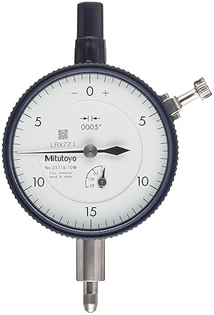 Standard dial indicator with a 0.375″ diameter stem, a #4-48 UNF contact point thread mount, and choice of white or black face, for measuring surface variations in fractional inches