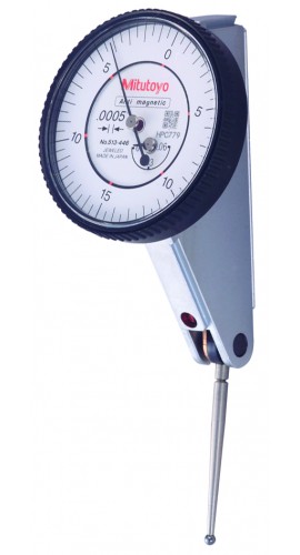 The Mitutoyo 513 series dial test indicator has a tilted face, a 0.375″ stem diameter, and inch measurements. The indicator has a reversible measuring direction and an adjustable contact point, and is used to measure surface variations in narrow or recessed areas. The face inclines 20 degrees from the axis of the indicator and three dovetail mounts, and can be mounted either horizontally or vertically from the front, top, or back of the indicator. It has a unified outer frame that prevents oil and water from permeating the front face, a hard frame body that provides rigidity and durability, and a clear, flat, and scratch-resistant crystal face. This dial indicator meets Japanese Industrial Standard (JIS) B7533-1990.