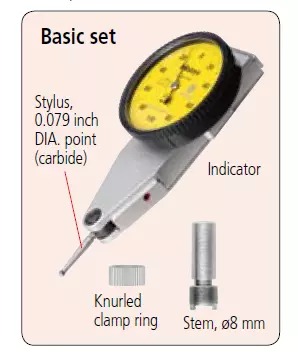 Basic Set includes test indicator with 2mm Contact Point, knurled clamp ring, and dovetail with 8mm Stem