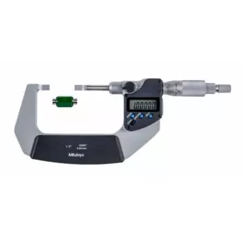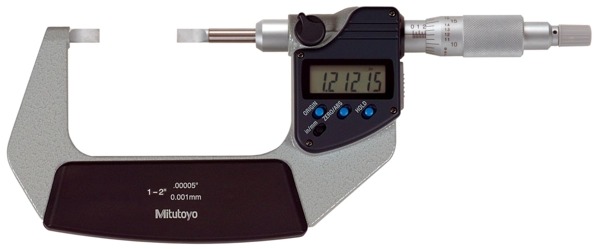 The Digimatic non-rotating spindle type blade micrometer quickly measures grooves, keyways and hard-to-reach areas with high accuracy. The Mitutoyo Digimatic blade micrometer utilizes a blade anvil and spindle for measuring difficult pieces such as groove diameters of shafts and keyways. The non-rotating spindle reduces torsion on softer parts being measured and prevents workpiece deformation and wear. A ratchet-stop mechanism provides uniform pressure on a workpiece for precise, repeatable measurements. Readings are displayed on an easy-to-read LCD readout.