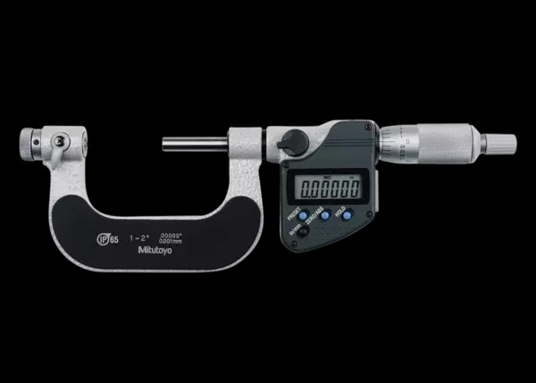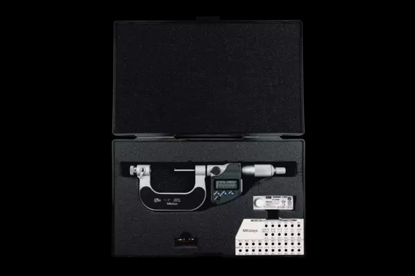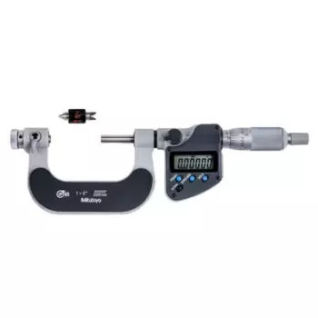 The Mitutoyo Digimatic screw thread digital micrometer uses interchangeable anvils and spindle tips to perform accurate measurement of different types of screw thread pitch diameters quicker and easier. The digital Mitutoyo 326-352-30 screw thread micrometer with interchangeable anvil and spindle tips uses optional V-anvil and conical spindle inserts interchangeably to precisely measure pitch diameters of metric or unified screw threads. A ratchet-stop mechanism provides uniform pressure on a workpiece for precise, repeatable measurements. Readings are displayed on an easy-to-read LCD readout.