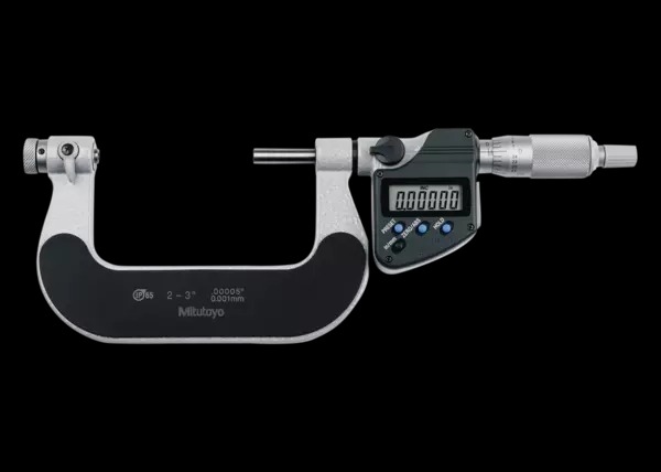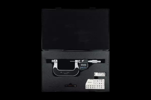 The Mitutoyo Digimatic screw thread digital micrometer uses interchangeable anvils and spindle tips to perform accurate measurement of different types of screw thread pitch diameters quicker and easier. The digital Mitutoyo 326-353-30 screw thread micrometer with interchangeable anvil and spindle tips uses optional V-anvil and conical spindle inserts interchangeably to precisely measure pitch diameters of metric or unified screw threads. A ratchet-stop mechanism provides uniform pressure on a workpiece for precise, repeatable measurements. Readings are displayed on an easy-to-read LCD readout.