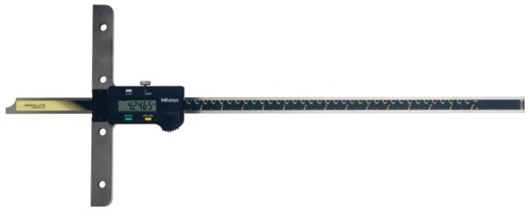 The Mitutoyo ABSOLUTE Digimatic depth gage provides highly accurate depth measurements for any shape that has a step, groove or slot. The Mitutoyo ABSOLUTE Digimatic depth gage features hardened, micro-lapped measuring faces and a base for improved accuracy and wear resistance. The Mitutoyo 571-214-10 digimatic depth gage is constructed of hardened stainless steel and is ideal for use on the shop floor. Measurements are displayed on a digital LCD readout with SPC output for easy, automatic recording.