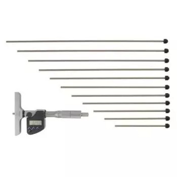 The Mitutoyo Digimatic depth micrometer with interchangeable rods measures a wide range of depths with high accuracy. Measurements are displayed on a digital LCD readout with SPC output for easy automatic recording. The Mitutoyo digital interchangeable rod type depth micrometer offers great versatility for measuring a range of depths with the included extension rods. The 329-251-30 depth micrometer’s rod contact measuring points are lapped and carbide tipped for incredible flatness and better precision. The ratchet stop mechanism provides uniform pressure for precise, repeatable measurements. The Mitutoyo 329 series of interchangeable depth micrometers allow users to take a wide variety of depth measurements and are offered in different ranges, graduations and base lengths. The interchangeable depth micrometers easy to use as well as switch out the different measuring rods depending on the depth you require for a specific application. Each time an interchangeable depth rod is switched out on the gage, the depth micrometer must be set again to a master. Gage blocks are most commonly used to set the Mitutoyo interchangeable depth micrometers and we are happy to assist you in finding a master for your depth gage if needed.