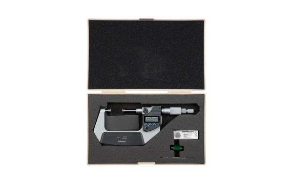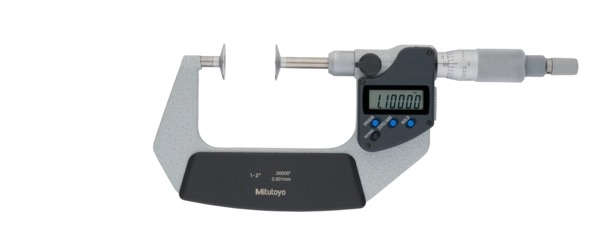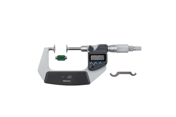 The Mitutoyo 369-351-30 Digimatic non-rotating spindle disc micrometer is designed to measure the root tangent length of spur gears and helical gears with high accuracy. The Mitutoyo digital disc micrometer with non-rotating spindle type uses flat discs and non-rotating spindle made with hardened steel in our own Japanese factory to measure lengths of spur and helical gears. The flatness and thinness of the discs allow for reliable measurements in tight spaces. The non-rotating spindle reduces torque on parts being measured and prevents workpiece deformation and wear. A ratchet-stop mechanism provides uniform pressure on a workpiece for precise, repeatable measurements. Readings are displayed on an easy-to-read LCD readout.