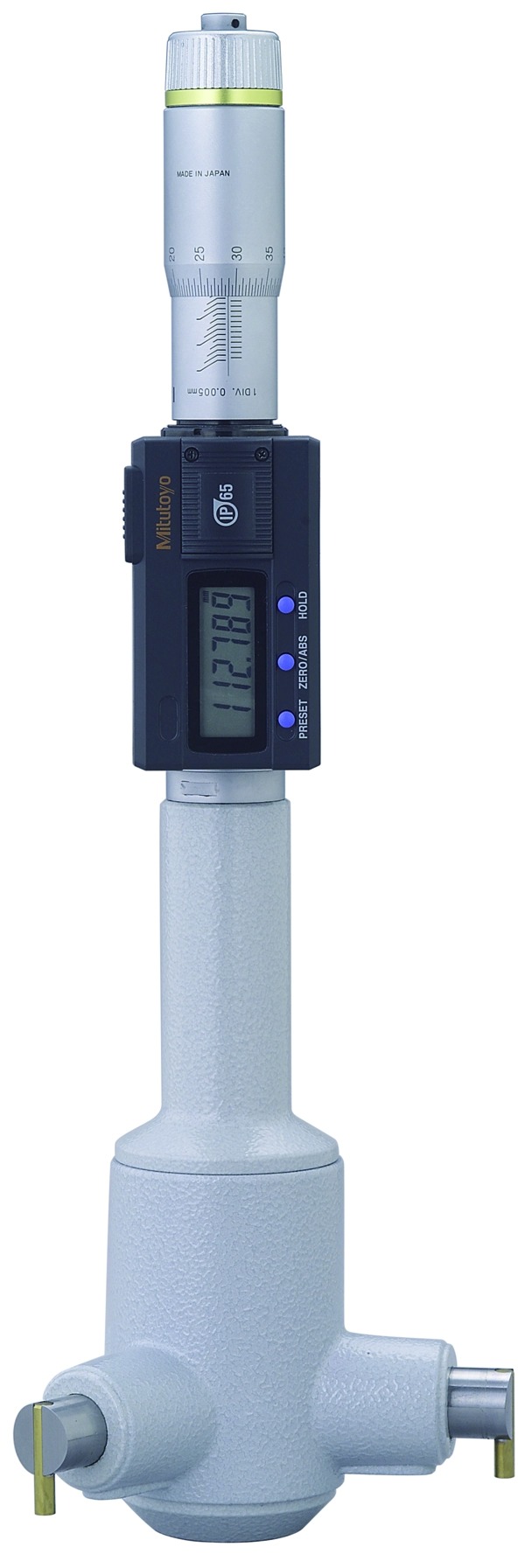 The Mitutoyo Digimatic Holtest internal micrometer utilizes three anvils and contact points for self-centering, precision measurements of the inside dimensions of bores. The 468-178 Mitutoyo Digimatic Holtest digital internal micrometer features self-centering anvils evenly spaced at 120° with contact points coated in Titanium Nitride (TiN) to provide accurate, sensitive measurements that are highly durable. Precision-machined gears ensure reliable, repeatable measurements that are shown on a large, easy-to-read LCD display in an impact and water resistant housing. The holtest’s ratchet stop mechanism provides a constant measuring force on the hardened-steel spindle to ensure accurate, even measurements.