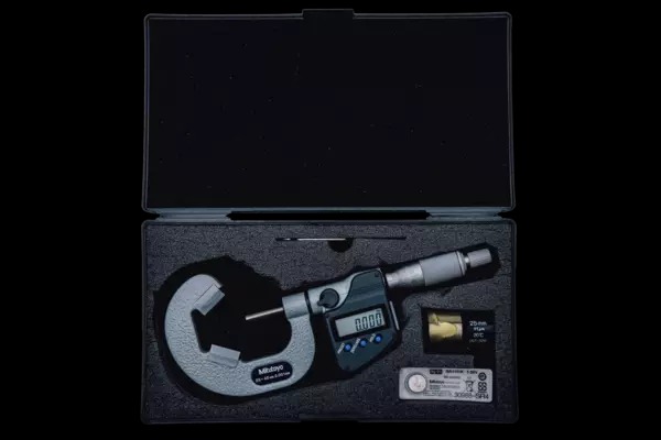 The Mitutoyo 314-253-30 Digimatic V-Anvil micrometer measures the outside diameter of cutting tools such as taps, reamers and end mills with three flutes. The Mitutoyo Digimatic V-Anvil digital micrometer pointed spindle and V-Anvil delivers precise position for highly accurate measurements. The anvil and spindle are precision milled from hardened steel for lasting, accurate results. A ratchet-stop mechanism provides uniform pressure on a workpiece for precise, repeatable measurements. Measurements are displayed on an easy-to-read LCD readout.