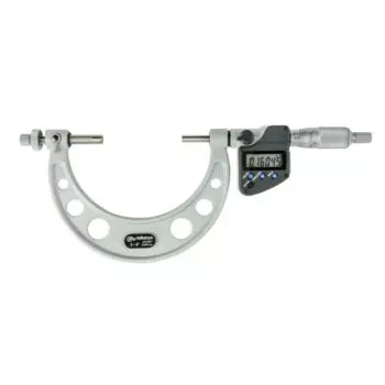 The Mitutoyo Digimatic digital gear tooth micrometer measures gear modules with precision using optional interchangeable anvil-spindle tips to measure different sizes and types of gears. The Mitutoyo 324-253-30 gear tooth micrometer measures the over-pin diameter of gears. Precision carbide anvil and spindle ball-tipped measuring surfaces are interchangeable, with optional ball-tip faces allowing for measurement of various gear modules. A ratchet-stop mechanism provides uniform pressure on a workpiece for precise, repeatable measurements. Readings are displayed on an easy-to-read LCD readout.