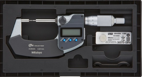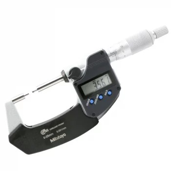 The Mitutoyo 331-261-30 Digimatic coolant-proof digital spline micrometer features a reduced diameter anvil and spindle for measuring splined shafts, slots and keyways. This micrometer has an IP65 dust and water protection level. The digital Mitutoyo spline micrometer is ideal for measuring minor indents, slots, spline shafts and keyways on workpieces. The anvil and spindle each have reduced diameters to better measure internal features with high accuracy. A ratchet-stop mechanism provides uniform pressure on a workpiece for precise, repeatable measurements. Measurements are displayed on a coolant-proof, easy-to-read LCD display.