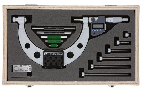The Mitutoyo 340-351-30 Digimatic outside digital micrometer features a ratchet stop function and interchangeable anvils for measuring a wide range of workpiece sizes and material types. The Mitutoyo digital outside micrometer with interchangeable anvils and ratchet stop is ideal for measuring metal and non-metal workpieces by controlling the amount of spindle force. A ratchet-stop mechanism provides uniform pressure on a workpiece for precise, repeatable measurements. Interchangeable anvils allow for measuring a wide range of workpiece sizes. Measurements are displayed on a coolant-proof, easy-to-read LCD readout.