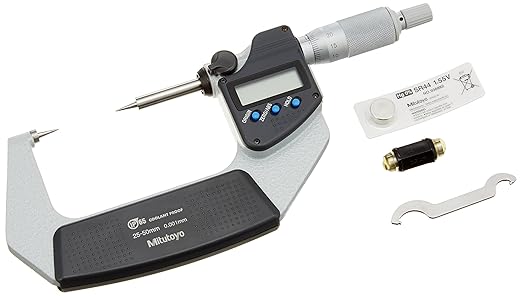 The 342-252-30 Digimatic pointed digital micrometer features 15-degree pointed anvil and spline to measure small grooves on parts or workpieces along with keyways and web thicknesses on drills with superior accuracy. The pointed anvil and spindle contacts are ideal at measuring small, hard-to-reach areas which a normal or reduce-diameter spindle and anvil are unable to access. A ratchet-stop mechanism provides uniform pressure on a workpiece for precise, repeatable measurements. Measurements are displayed on an easy-to-read LCD readout.