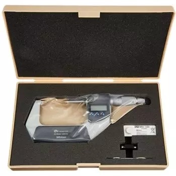 The Mitutoyo 342-262-30 Digimatic coolant-proof point micrometer features pointed tips on the anvil and spindle to measure web thickness of drills, small grooves, keyways and other difficult to reach areas. This micrometer has an IP65 dust and water protection level. The Mitutoyo Digimatic pointed digital micrometer features 15-degree pointed anvil and spline to measure small grooves on parts or workpieces along with keyways and web thicknesses on drills with superior accuracy. The pointed anvil and spindle contacts are ideal at measuring small, hard-to-reach areas which a normal or reduce-diameter spindle and anvil are unable to access. A ratchet-stop mechanism provides uniform pressure on a workpiece for precise, repeatable measurements. Measurements are displayed on an easy-to-read LCD readout.