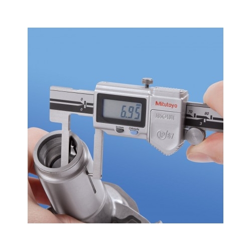 This Mitutoyo ABSOLUTE Digimatic Neck Point Jaw Caliper is waterproof and suitable for use in the presence of coolant or cutting oil. This neck point jaw caliper is used to measure wall thickness inside bores and recesses. The ABSOLUTE system scale provides error-free, high-speed measurement with SPC data output.