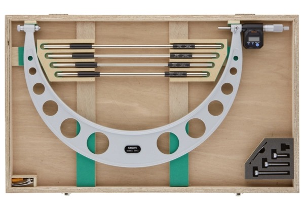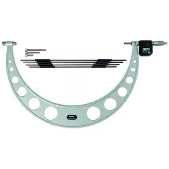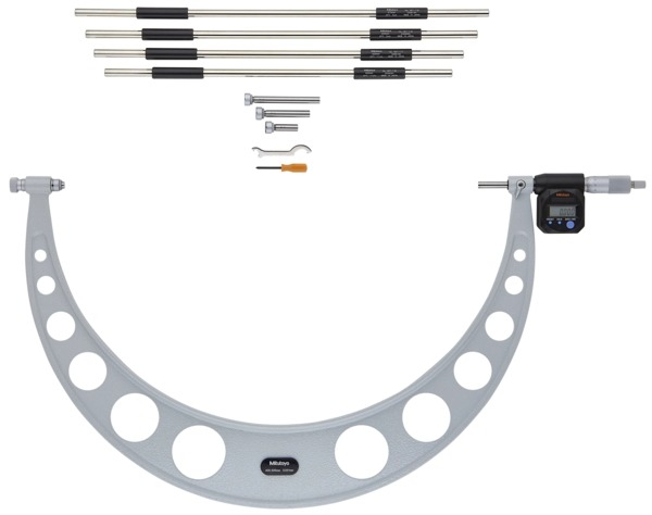 The Mitutoyo 340-521 Digimatic outside digital micrometer features a ratchet stop function and interchangeable anvils for measuring a wide range of workpiece sizes and material types. The Mitutoyo digital outside micrometer with interchangeable anvils and ratchet stop is ideal for measuring metal and non-metal workpieces by controlling the amount of spindle force. A ratchet-stop mechanism provides uniform pressure on a workpiece for precise, repeatable measurements. Interchangeable anvils allow for measuring a wide range of workpiece sizes. Measurements are displayed on a coolant-proof, easy-to-read LCD readout.