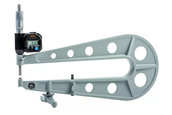 The Mitutoyo 389-514 Digimatic sheet metal micrometer is designed with a deep measuring throat to enable multiple measurements across a linear plane on materials such as sheet metal, paper, plastic and rubber. This micrometer has an IP65 dust and water protection level. The Mitutoyo digital sheet metal micrometer is available with a 6-inch or 12-inch throat, allowing the user to take measurements in the middle of sheets of metal, plastic, rubber and paper with high accuracy. Readings are displayed on an easy-to-read LCD readout with accessible function buttons. The coolant-proof micrometer’s ratchet thimble mechanism provides a constant measuring force on the spindle to ensure accurate, repeatable measurements.