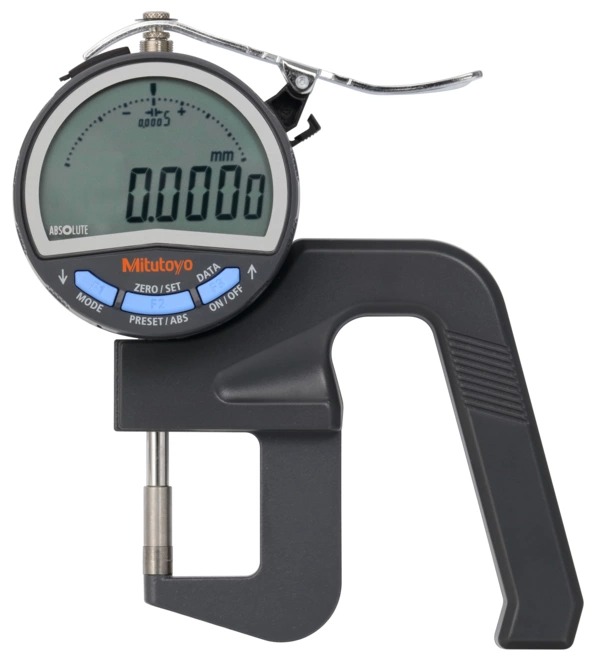 This ABSOLUTE Digimatic Thickness Gauge with 1 µm digital step enables you to measure film, paper, etc., with flat contact points.