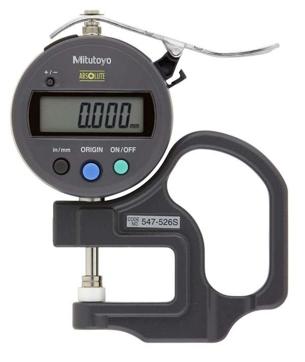 The Mitutoyo 547-526S flat anvil digital gage quickly measures the thickness of different materials or objects with high accuracy. Measurements are shown on an easy-to-read LCD display. These gages are available with a standard or deep-throated frame. The Mitutoyo flat anvil ABSOLUTE thickness gage can measure the thickness of a wide range of materials and objects including paper, film, wire, sheet metal and other similar materials. These flat anvil thickness gages utilize the Mitutoyo ID-C and ID-S Digimatic indicators to provide error-free LCD readings. The grip handle, easy-to-reach lifting lever and spring-loaded spindle allows for quick and easy measurements without sacrificing accuracy.