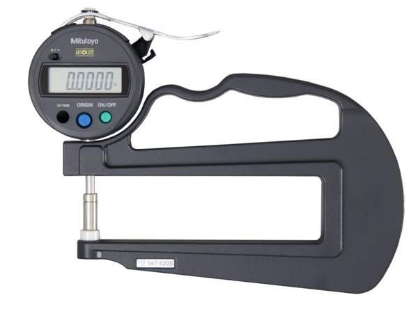 The Mitutoyo 547-520S flat anvil digital gage quickly measures the thickness of different materials or objects with high accuracy. Measurements are shown on an easy-to-read LCD display. These gages are available with a standard or deep-throated frame. The Mitutoyo flat anvil ABSOLUTE thickness gage can measure the thickness of a wide range of materials and objects including paper, film, wire, sheet metal and other similar materials. These flat anvil thickness gages utilize the Mitutoyo ID-C and ID-S Digimatic indicators to provide error-free LCD readings. The grip handle, easy-to-reach lifting lever and spring-loaded spindle allows for quick and easy measurements without sacrificing accuracy.