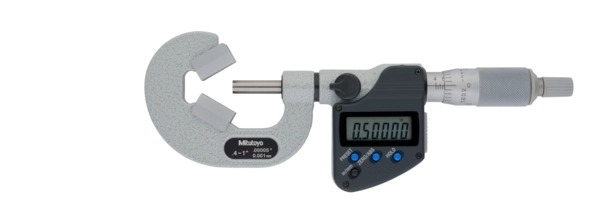 The Mitutoyo 314-352-30 Digimatic V-Anvil micrometer measures the outside diameter of cutting tools such as taps, reamers and end mills with three flutes. The Mitutoyo Digimatic V-Anvil digital micrometer pointed spindle and V-Anvil delivers precise position for highly accurate measurements. The anvil and spindle are precision milled from hardened steel for lasting, accurate results. A ratchet-stop mechanism provides uniform pressure on a workpiece for precise, repeatable measurements. Measurements are displayed on an easy-to-read LCD readout.