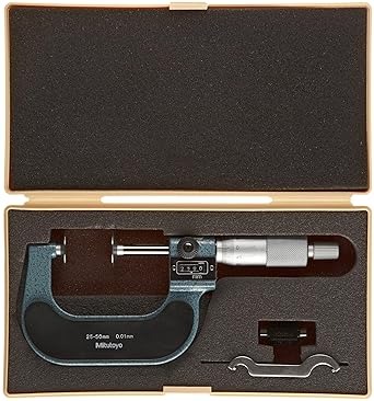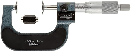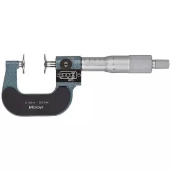 The Mitutoyo 223-101 mechanical counter disc micrometer is designed to measure the root tangent length of spur gears and helical gears within +/- 0.004mm of accuracy. Measurements are displayed on an analog digit counter on the frame. The Mitutoyo disk micrometers with mechanical counter are available in inch or metric units. The Mitutoyo disc micrometer uses flat discs constructed of hardened steel in our own Japanese facilities to measure lengths of spur and helical gears. The flatness and thinness of the discs allow for reliable measurements in tight spaces. A ratchet-stop mechanism provides uniform pressure on a workpiece for precise, repeatable measurements and eliminates over-speed error.