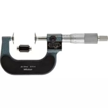 The Mitutoyo 223-102 mechanical counter disc micrometer is designed to measure the root tangent length of spur gears and helical gears within +/- 0.004mm of accuracy. Measurements are displayed on an analog digit counter on the frame. The Mitutoyo disk micrometers with mechanical counter are available in inch or metric units. The Mitutoyo disc micrometer uses flat discs constructed of hardened steel in our own Japanese facilities to measure lengths of spur and helical gears. The flatness and thinness of the discs allow for reliable measurements in tight spaces. A ratchet-stop mechanism provides uniform pressure on a workpiece for precise, repeatable measurements and eliminates over-speed error.
