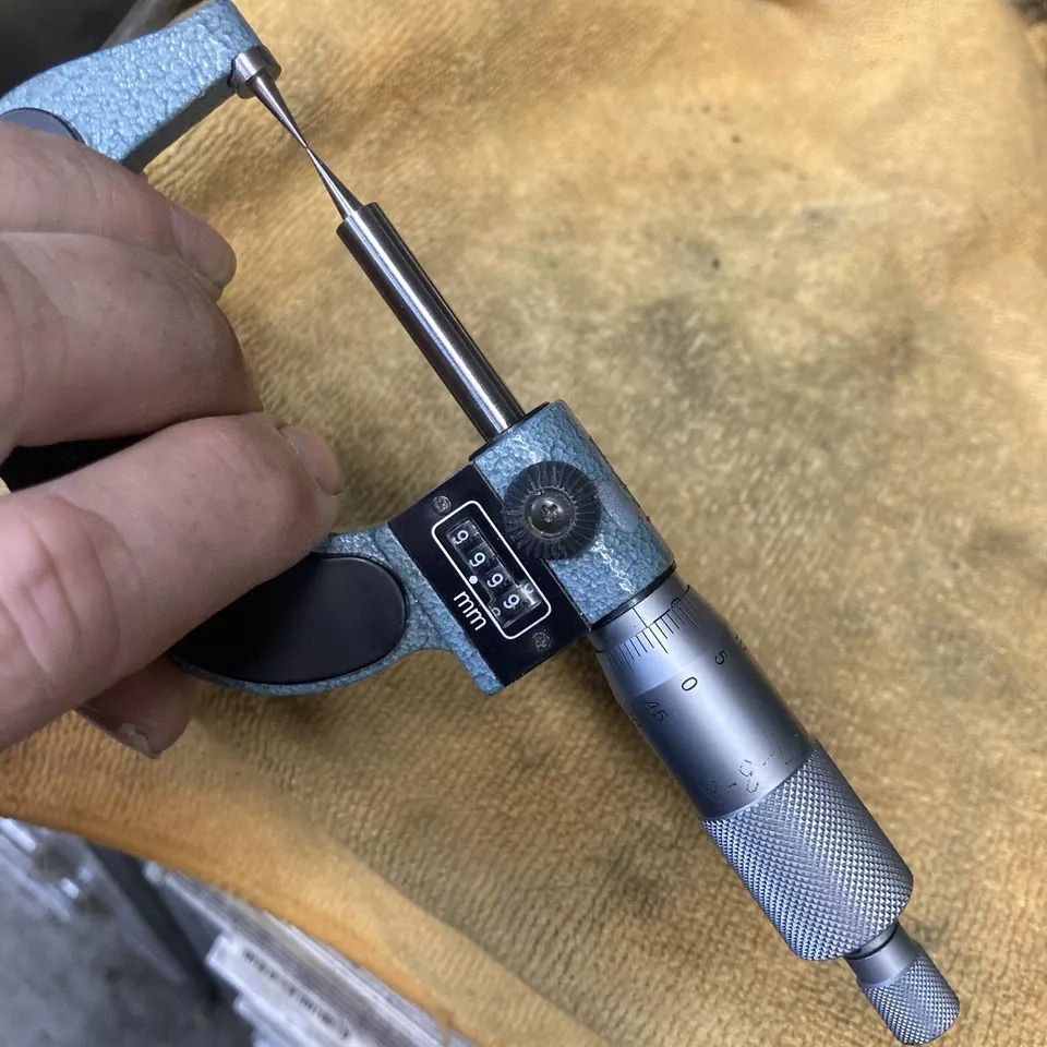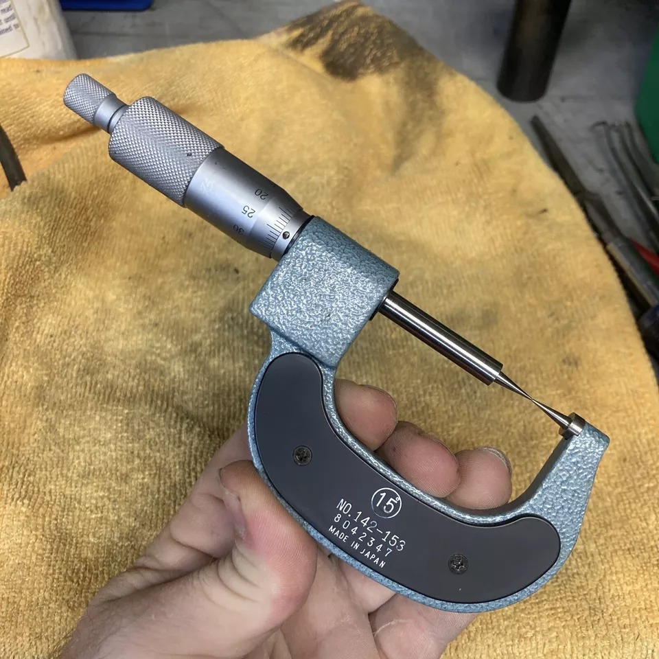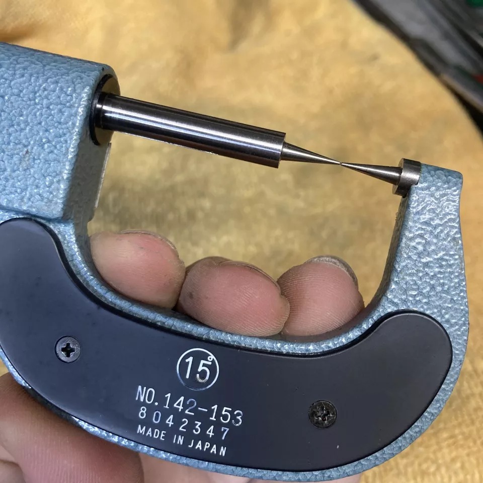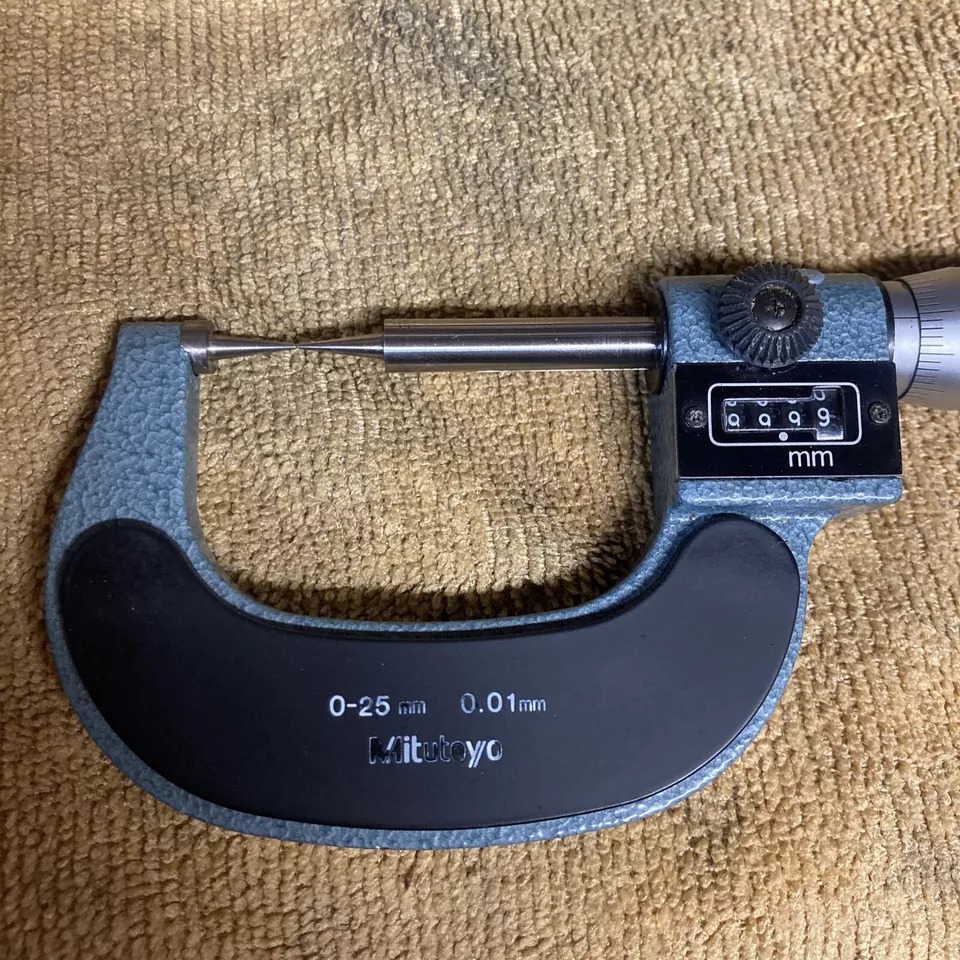This Mitutoyo mechanical counter point micrometer has a pointed spindle and a pointed anvil for measuring the web thickness of drills, small grooves, keyways and other hard-to-reach dimensions. The measuring points have approximately 0.3mm radius, with a ratchet stop for constant force, and a digit counter. The points do not have carbide tips.