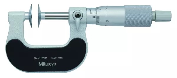 The Mitutoyo 123-101 mechanical counter disc micrometer is designed to measure the root tangent length of spur gears and helical gears within +/- 0.0002″ of accuracy. Measurements are displayed on an analog digit counter on the frame. The Mitutoyo disk micrometers with mechanical counter are available in inch or metric units. The Mitutoyo disc micrometer uses flat discs constructed of hardened steel in our own Japanese facilities to measure lengths of spur and helical gears. The flatness and thinness of the discs allow for reliable measurements in tight spaces. A ratchet-stop mechanism provides uniform pressure on a workpiece for precise, repeatable measurements and eliminates over-speed error.
