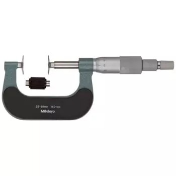 The Mitutoyo 169-202 mechanical non-rotating spindle disc micrometer is designed to measure the root tangent length of spur gears and helical gears with high accuracy. The Mitutoyo mechanical disc micrometer with non-rotating spindle uses flat discs constructed of hardened steel in our own Japanese facilities to measure lengths of spur and helical gears. The non-rotating spindle prevents workpiece deformation and wear by reducing torque on parts being measured. The flatness and thinness of the discs allow for reliable measurements in tight spaces. A ratchet-stop mechanism provides uniform pressure on a workpiece for precise, repeatable measurements and eliminates over-speed error.