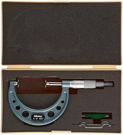 The Mitutoyo 169-206 mechanical non-rotating spindle disc micrometer is designed to measure the root tangent length of spur gears and helical gears with high accuracy. The Mitutoyo mechanical disc micrometer with non-rotating spindle uses flat discs constructed of hardened steel in our own Japanese facilities to measure lengths of spur and helical gears. The non-rotating spindle prevents workpiece deformation and wear by reducing torque on parts being measured. The flatness and thinness of the discs allow for reliable measurements in tight spaces. A ratchet-stop mechanism provides uniform pressure on a workpiece for precise, repeatable measurements and eliminates over-speed error.