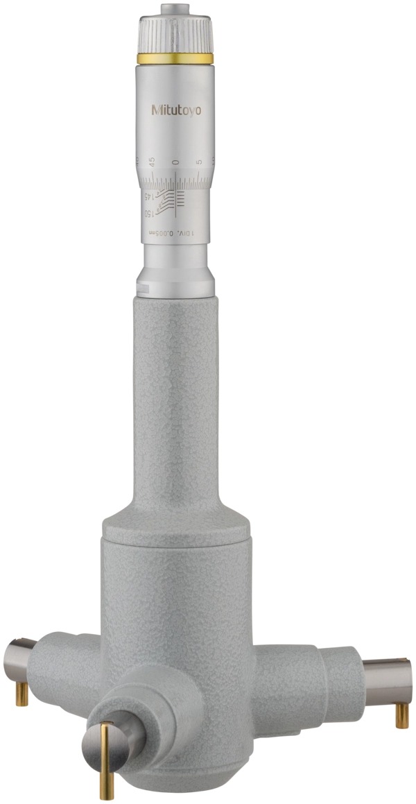 The Mitutoyo Holtest mechanical three-point internal micrometer utilizes three self-centering anvils with precision contact points for accurate and efficient measurements of inside dimensions of bores. The Mitutoyo mechanical Holtest internal micrometer features three hardened-steel anvils evenly spaced at 120° for true alignment of the axis bore for accurate, easily repeatable measurements. Contact points are coated with Titanium Nitride (TiN)* for added durability and precision. The holtest’s ratchet stop mechanism provides a constant measuring force on the hardened-steel spindle to ensure accurate, even measurements.