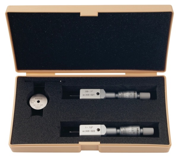 The Mitutoyo 368-926 Holtest two-point micrometer set has hardened steel points, a measurement range of 0.08 to 0.12”, and is precise to 0.0001”, with + or – 0.0001” of accuracy. Hardened steel measuring contact points offer hardness and durability, while contact point geometry allows the instrument to measure to the bottom of a blind hole. The ratchet stop offers constant force for repeatability. Includes inspection certificate ensuring that the exact micrometer purchased has met National Institute of Standards and Technology master standards. This gage set includes two complete display units, setting ring, and a fitted plastic case.